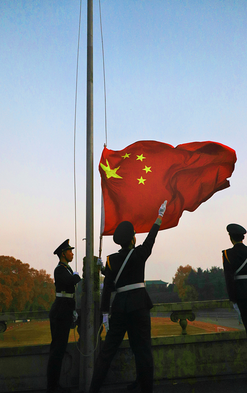上午7时,升旗仪式正式开始,国旗护卫队队员护卫着五星红旗,迈着铿锵有力、整齐划一的步伐来到升旗台前。在雄壮嘹亮的国歌声中,鲜艳的五星红旗迎着朝阳冉冉升起,全体师生行注目礼,高唱国歌,满怀深情向国旗致以最崇高的敬意。