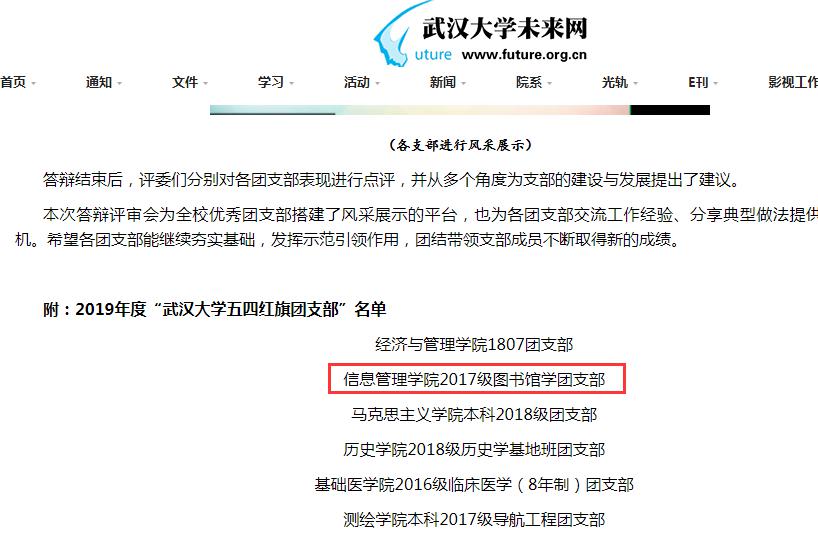 2017级图书馆学团支部始终牢记共青团是党的忠实助手和忠诚后备军。认真组织开展“不忘初心,牢记使命”“青春心向党,建功新时代”“青春正能量、同心抗疫情”等主题团日活动,先后向党组织推荐12名优秀共青团员成为中共党员,23名成员成为入党积极分子,向校院各级员工组织输送主要员工干部20余名;团支部同学勤学奋进,支部内组建了科研小组,定期开展学术沙龙,坚持每堂课前点名,形成了“爱学、比学、帮学、督学”的良好学风氛围。团员绩点3.7以上超过30%,2019年度共有14人获得奖学金,24人参与科研立项,24人参与“自强杯”、电子商务三创赛等学科竞赛,斩获12个奖项;积极开展社会实践和志愿服务活动,2019年度,支部成员参与10项假期社会实践项目,其中1项获评湖北省暑期社会实践优秀团队、永利集团暑期社会实践十佳调研报告,4项获评永利集团社会实践优秀成果。支部成员年度总服务时长超过900小时,涌现出军运会等大型赛事优秀志愿者多名。抗疫期间,支部成员更是主动参与社区值守、线上家教等志愿活动,用行动彰显了青春正能量。