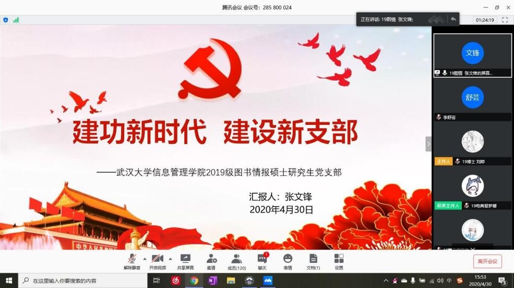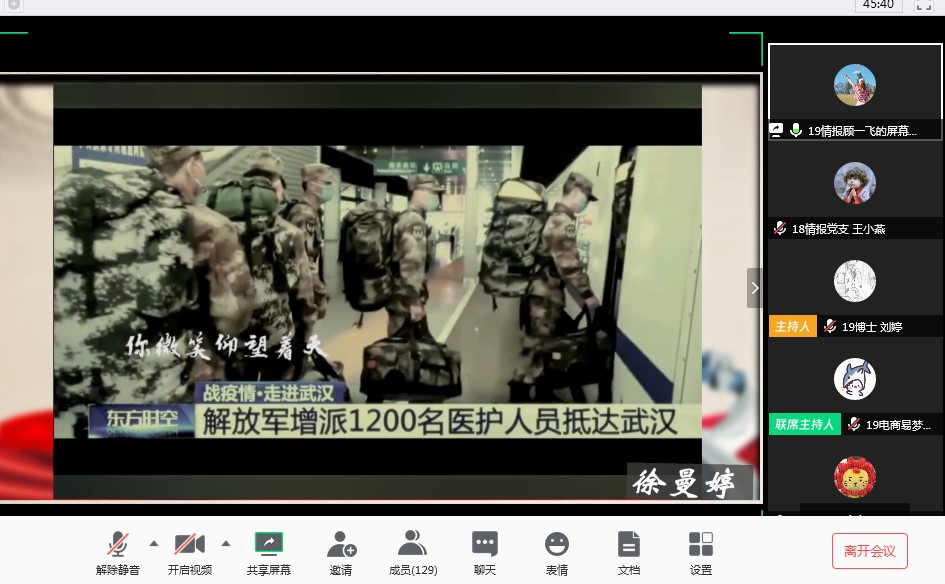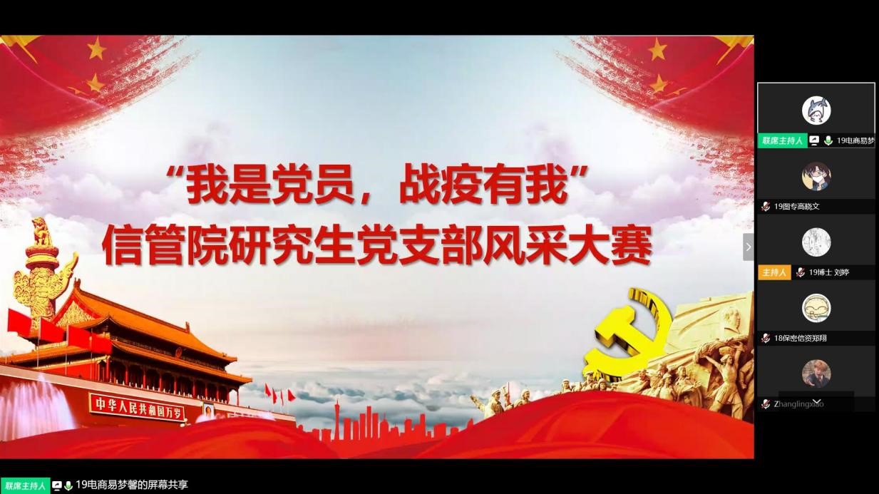 2018级管理科学与工程硕士研究生党支部、2018级图书馆学硕士研究生党支部以视频的形式展现了支部党员在疫情中自我隔离、宣传科普、投身科研、自我提升、志愿服务、积极捐款的事迹与风貌。2019级图书情报硕士研究生党支部、2019级图书馆学硕士研究生党支部、2019级电子商务硕士研究生党支部、2019级情报学硕士研究生党支部、2018级出版硕士研究生党支部将PPT演示与视频展示相结合,形式多样地呈现了支部党员的基本组织生活、特色工作和优秀风采。其中,2019级图书情报硕士研究生党支部以视频形式展现了支部开展“‘疫’战到底——防疫知识竞答”的抗击新冠肺炎疫情主题党日活动;2019级图书馆学硕士研究生党支部展现了丰富多彩的党内基本组织生活,如先后开展“勇担使命,同心抗疫”和“世界防疫形势与中国大国担当”主题党支部会议,健康生活、积极学习每日打卡主题党日活动,学习贯彻习近平总书记给在首钢医院实习的西藏大学医公司员工重要回信精神的集体学习活动,以及积极参与公司和公司组织的各项主题教育活动等;2019级情报学硕士研究生党支部的全体党员和积极分子都参与录制视频,表达为武汉加油、盼望疫情早日结束的心情,并分享了各自在疫情期间居家学习的所见所闻所感,支部积极分子徐曼婷用琵琶独奏了《我和我的祖国》,寄托对祖国的热爱之情。