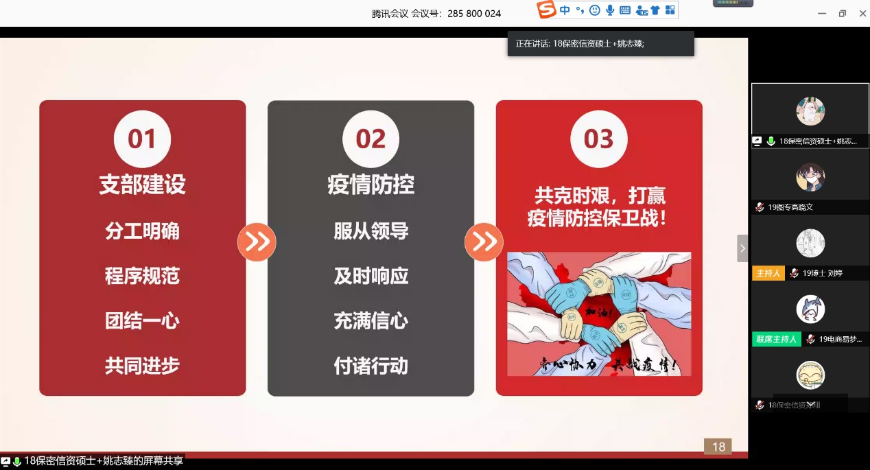 不少党支部都用图文并茂的形式展示了支部在抗疫期间充分发挥研究生党组织的战斗堡垒作用、积极开展主题教育活动、落实“三会一课”制度、发动党员积极抗疫的风采。2018级保密信资硕士研究生党支部通过开展线上抗疫主题党日活动,积极学习习近平总书记关于做好新型冠状病毒感染的肺炎疫情防控工作的重要讲话和指示精神,学习《中华人民共和国突发事件应对法》等与突发公共卫生事件紧密相关的重要法律、法规,普及防疫科学知识、交流分享抗疫英雄事迹。2019级出版硕士研究生党支部以线上交流的方式,将组织生活常态化、贯彻落实深入化,先后召开“防疫献力”线上组织生活会和开展“宅家抗疫·线上打卡”活动,支部党员积极就学习和生活近况以及对于疫情的思考进行交流和分享,并自发捐款助力防疫、参加公司党委组织的各项学习活动,不少党员还通过书法、绘画等多种艺术形式为武汉加油。2019级档案学硕士研究生党支部以生动的讲述介绍了本支部在疫情期间通过主题党日活动、支部微党课、“鲲鹏云”学习宣讲活动提高思想觉悟和对疫情的认知,以及支部党员积极参与捐款和社区服务的先进事迹。2019级博士研究生党支部通过举办“不忘初心、勇担使命、同心抗疫”主题党日活动、开展自愿捐款和防疫知识竞赛、以手写形式抒发抗疫感慨、进行线上即时交流等方式,增强支部凝聚力,提高党员勇担使命的觉悟。