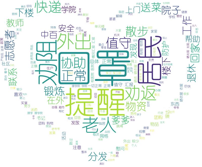 公司值守任务结束后,一位参与值守任务的突击队员根据值守工作每日汇报,做成了一张词云图,“口罩”“提醒”“劝阻”“居民”“老人”是其中最大的关键词。是的,突击队员们做着普普通通的小事,在这个疫情防控的特殊时期,平凡而又勇敢的他们,把党的号召落实在行动上,把党员的责任抗在肩上,把居民的健康放在心上,风雨同行,坚持值守,无怨无悔,他们是一群可爱的信管人。