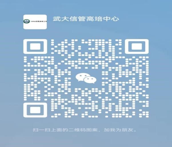 4、参训学员请用微信扫下方二维码添加研修班办公微信:“武大信管高培中心”(微信号:wdxggpzx666), 并请填写验证信息“姓名+首届全国数字素养与技能提升高级研修班”。 研修班将建立微信群。